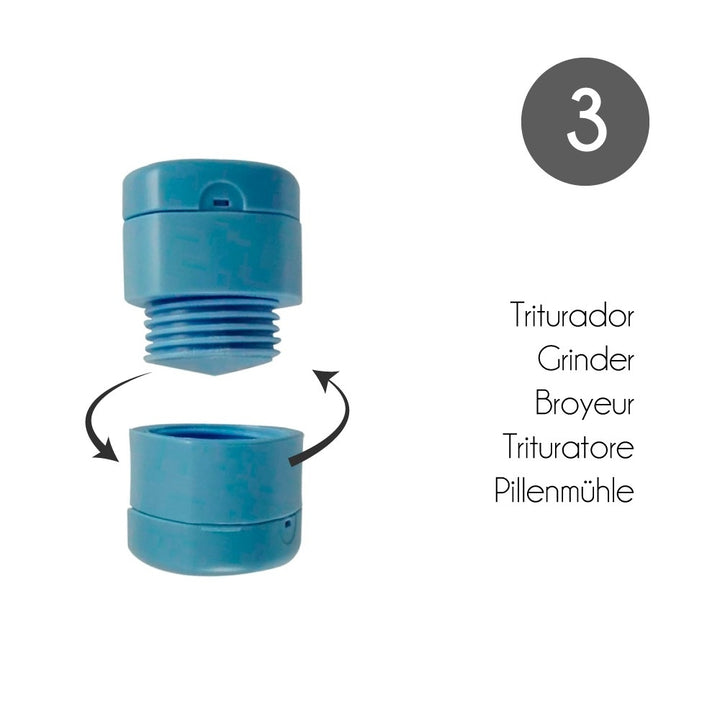 Het is erg handig omdat, deze 3 in 1 pillendoos aan één kant, een klein reservoir heeft waarin de pillen bewaard kunnen worden. In het midden kan het worden losgeschroefd om als vermaler te dienen, zodat u de pillen gemakkelijk tot poeder kunt vermalen, en aan het andere uiteinde brengt een klein mesje dat de pil zonder enige moeite of moeite kan doorsnijden.