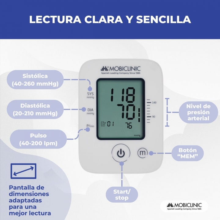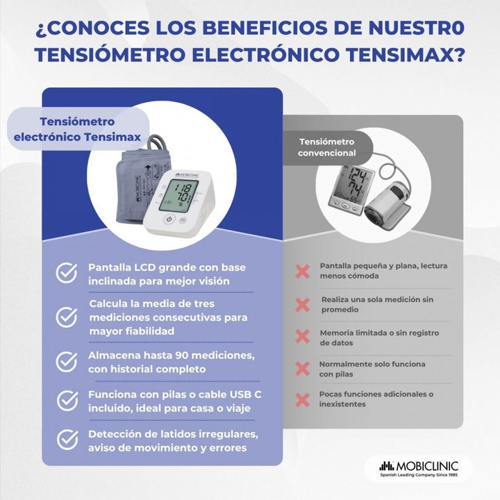 Das Tensimax-Arm-Blutdruckmessgerät bietet eine umfassende, intuitive und präzise Möglichkeit zur Blutdrucküberwachung zu Hause. Dank der zentralen Taste ist es einfach zu bedienen und für jeden Benutzer zugänglich. Der geneigte Standfuß verbessert die Sichtbarkeit und ermöglicht ein komfortables Ablesen der Ergebnisse.