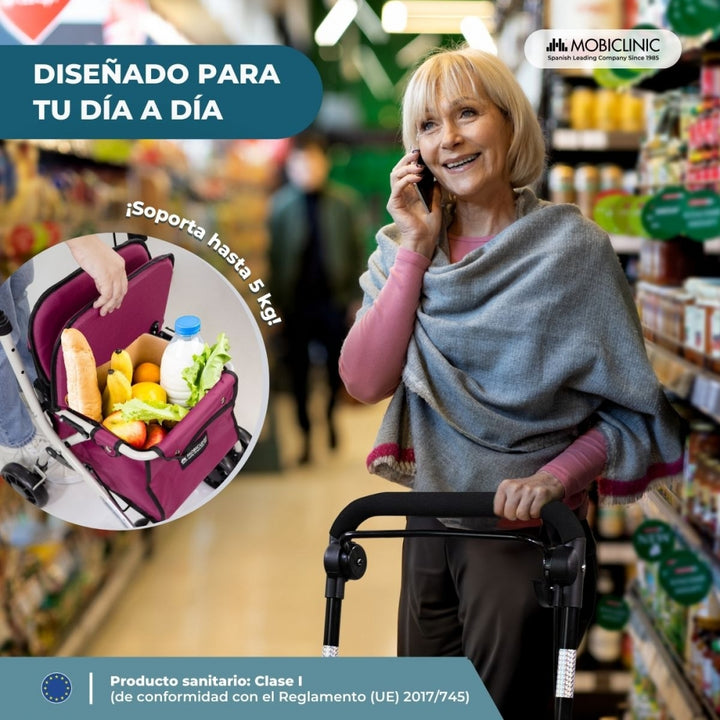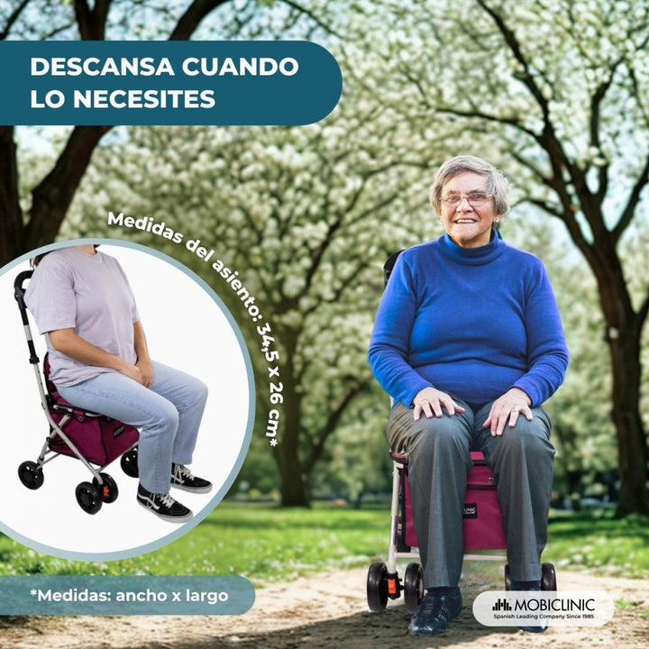 Dieser Einkaufswagen verfügt außerdem über einen bequemen, robusten und gepolsterten Sitz, sodass Sie sich beim Bummeln oder Warten in langen Schlangen auf dem Markt ausruhen können. Er hat außerdem eine Rückenlehne zum Entspannen und eine abnehmbare, wasserdichte und waschbare Einkaufstasche, die bis zu 5 kg trägt. Der Coliseo-Einkaufswagen ist ein Einhebel-Einkaufswagen, sodass der Benutzer ihn mit einer Hand bedienen kann, zum Beispiel beim Spazierengehen mit dem Enkelkind oder dem Hund. Er ist außerdem höhenverstellbar und verfügt über drei Positionen: 86,5 cm, 91,5 cm und 96,5 cm . So kann er an die Körpergröße des Benutzers angepasst werden und während der Benutzung eine bequeme und ergonomische Haltung gewährleistet werden.