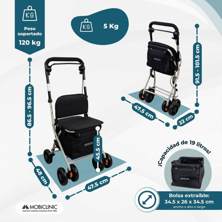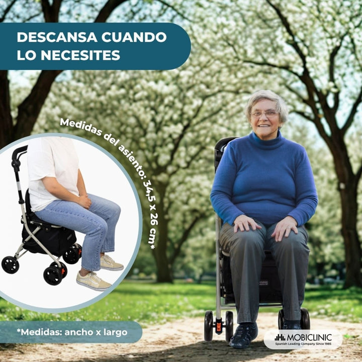 Dieser faltbare Wagen verfügt über einen gepolsterten, bequemen und widerstandsfähigen Sitz, auf dem Sie sich während eines Spaziergangs oder beim Warten in langen Schlangen auf dem Markt ausruhen können. Darüber hinaus bietet er eine Rückenlehne zur Entspannung des Rückens und eine abnehmbare, wasserdichte und waschbare Einkaufstasche, die bis zu 5 kg tragen kann. Der Coliseo-Einkaufswagen kann einhändig bedient werden, sodass Sie ihn mit einer Hand bedienen können, während Sie zum Beispiel mit Ihrem Enkelkind oder Ihrem Hund spazieren gehen.