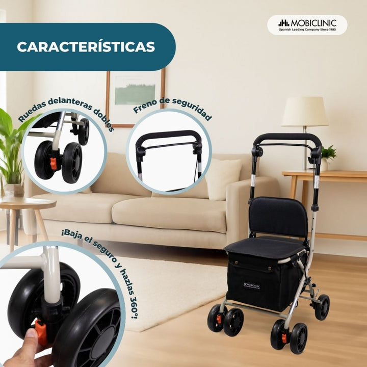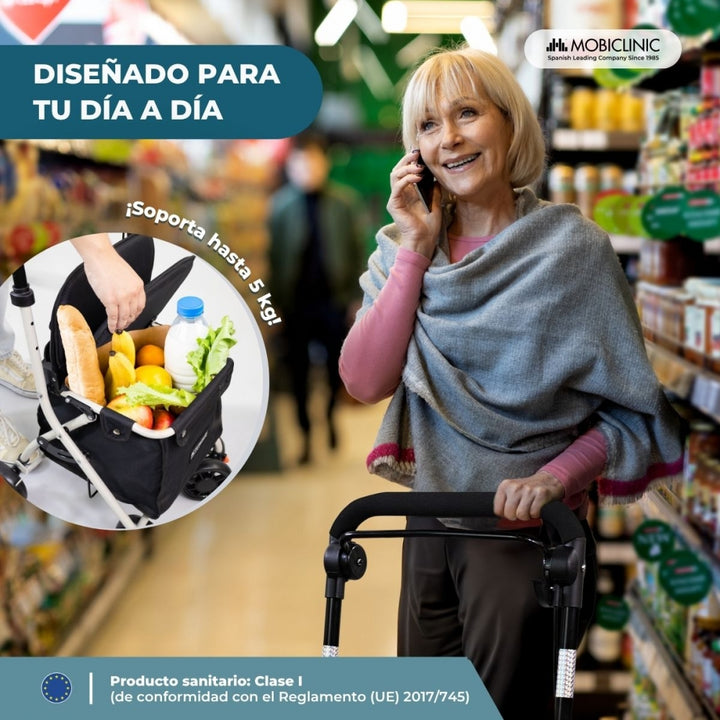 Einkaufswagen Rollator | 4 Räder | Zusammenklappbar | Mit Tasche | Mit Bremssystem | Schwarz | Coliseo | Mobiclinic