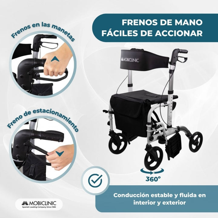 Der leichte und robuste Aluminiumrahmen mit einer Tragkraft von bis zu 136 kg garantiert Sicherheit. Die in die Griffe integrierten Handbremsen sind selbst für Personen mit eingeschränkter Handkraft leicht zu bedienen und sorgen für ein sicheres Fahrgefühl.