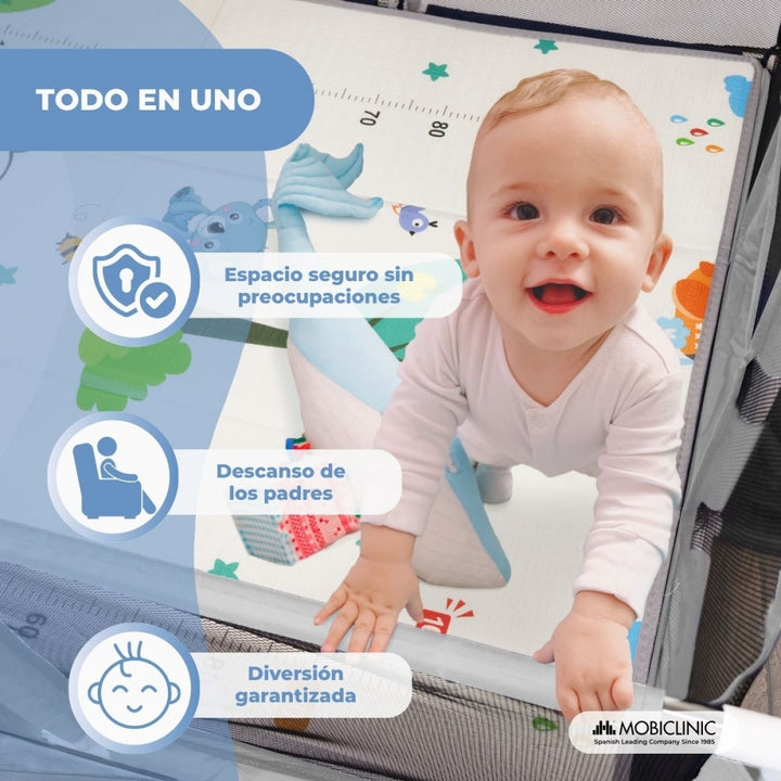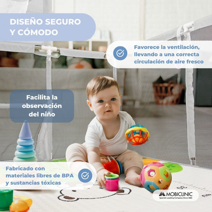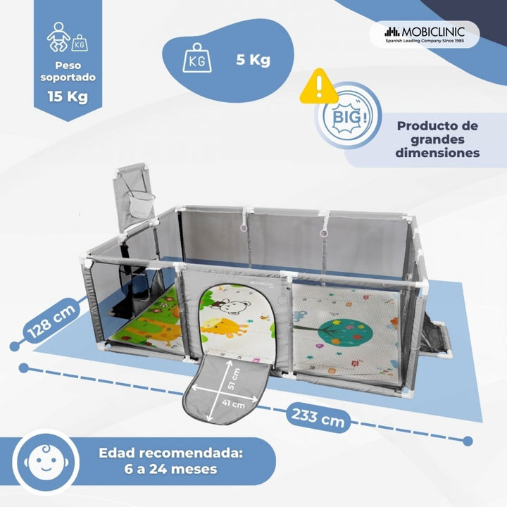 Dank seiner Maße von 128 x 233 cm bietet es eine geräumige und bequeme Spielfläche, auf der die Kleinen sicher krabbeln, stehen, spielen oder ihre ersten Schritte üben können. Die mitgelieferte Matte sorgt zudem für eine gepolsterte Oberfläche, die den Boden isoliert und das Spiel- oder Ruheerlebnis verbessert.