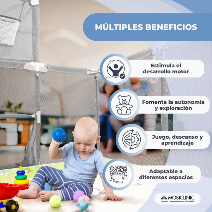 Um die Selbstständigkeit und Koordination der Kleinen zu fördern, verfügt der Laufstall über vier Sicherheitsringe, die dem Baby dabei helfen, schrittweise und sicher das Stehen zu erlernen. Die atmungsaktiven Netzwände ermöglichen Eltern, ihr Baby jederzeit im Blick zu behalten und sorgen für eine konstante Belüftung.