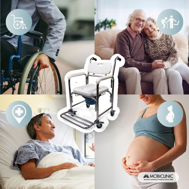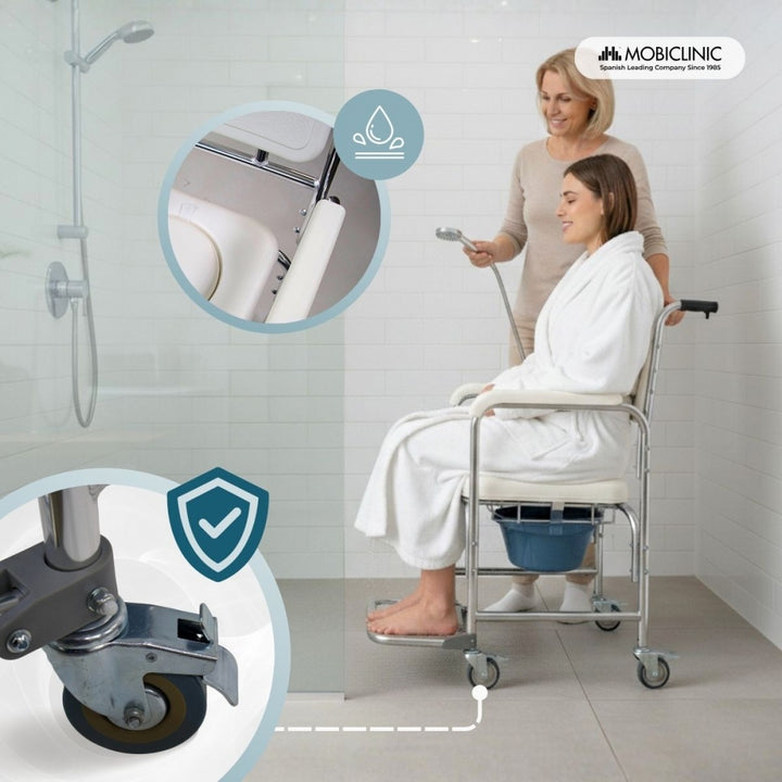Er ist vielseitig einsetzbar und kann als Toilettenstuhl, Duschstuhl, Toilettensitzerhöhung und Transferstuhl verwendet werden und passt sich so den Bedürfnissen aller Nutzer an. Er verfügt über Bremsen an allen vier Rädern für zusätzliche Sicherheit und um unbeabsichtigte Bewegungen zu verhindern.